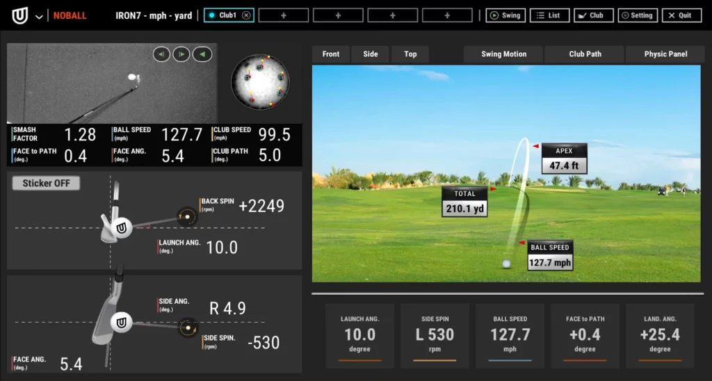 A double-camera based launch monitor that provides real-time accessibility to the actual ball spin and club path movement. Provides consistent and accurate super-speed and fundamental data readability.